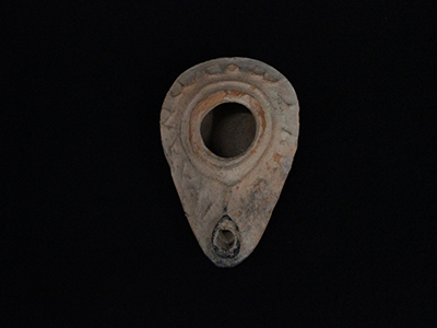 Die Öllampe aus Ton stammt aus Beth Ihl in Palästina und wurde im Jahre 1908 von C. Watzinger für das Akademische Kunstmuseum Bonn erworben. Der Ton ist hellorange bis ziegelrot und weist Glimmer und Eiseneinsprengsel im Ton auf. Die Öllampe ist birnenförmig mit einer leicht begradigten Schnauze. Auf der Schulter sind plastische Ornamente in Form degenerierter griechischer Schriftzeichen erkennbar. Es sind zwei Öffnungen erkennbar: Für den Docht (lat. „filum“) und zum Einfüllen des Öls.