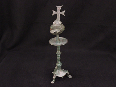 Der Griff dieser Lampe ist mit einem großen Kreuz bestückt. Nicht jede Lampe mit christlicher Symbolik ist in kultischem Gebrauch gewesen. Im Gegenteil finden sich christliche Symbole auf zahlreichen Objekten des täglichen Gebrauchs. Die Menschen waren sich jedoch der christlichen Konnotation des Lichtes bewusst. Jesus Christus gilt als „Licht der Welt“ und über den berühmten syrischen Heiligen Simeon Stylites schrieb der antike Autor Theodoret von Kyros: „Denn viele Tausende von Ismaeliten, die der Finsternis der Gottlosigkeit dienten, hat sein Stehen auf der Säule erleuchtet“ (Historia Religiosa, 163). Lampen mit Kreuzverzierungen können daher für Gläubige eine zusätzliche Bedeutung gehabt haben.